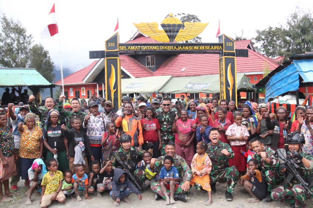 Intan Jaya // nusantararaya.com/ Mayor Inf Dedy Pungky Irawanto, S.I.P., M.I.Pol, Dansatgas Pamtas Mobile Yonif 330/Tri Dharma menerima tongkat komando “TOPE SONOWI KOA” sebagai bentuk penghormatan dan ucapan terimakasih masyarakat Intan Jaya kepada Satgas Pamtas Mobile Yonif 330/Tri Dharma Kostrad yang telah banyak berkontribusi dalam membantu kehidupan Masyarakat selama masa penugasannya di Kabupaten Intan Jaya, Papua Tengah. “TOPE SONOWI KOA” diambil dari bahasa Moni. “Tope” berarti besar, “Sonowi” artinya pemimpin dan “Koa” merujuk pada Tongkat yang dipegang oleh seseorang. Secara garis besar arti “TOPE SONOWI KOA” adalah Tongkat Sang Pemimpin Besar.