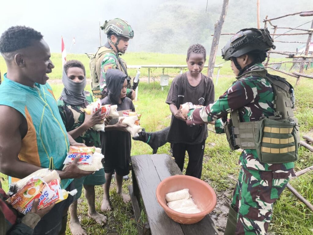 Mbuwa Nduga // nusantararaya.com / PenKoopsTNI – Satuan Tugas Batalyon Infanteri (Satgas Yonif) Para Raider 432/Waspada Setia Jaya Kostrad, salah satu Satuan Jajaran Komando Operasi TNI (KOOPS TNI) di Papua, tengah melaksanakan tugas Operasi Pengamanan Perbatasan Mobil RI-PNG, khususnya di wilayah Kabupaten Nduga, Provinsi Papua Pegunungan. Pada hari Sabtu, 27 Juli 2024, Tim Patroli Satgas Yonif 432 Kostrad melaksanakan patroli pengamanan di wilayah Distrik Mbuwa, tepatnya Kampung Arugia. Di sela kegiatan pengamanan, para Prajurit TNI berkesempatan membagikan Sembako secara cuma-cuma kepada para warga yang dijumpai sepanjang rute patroli.
