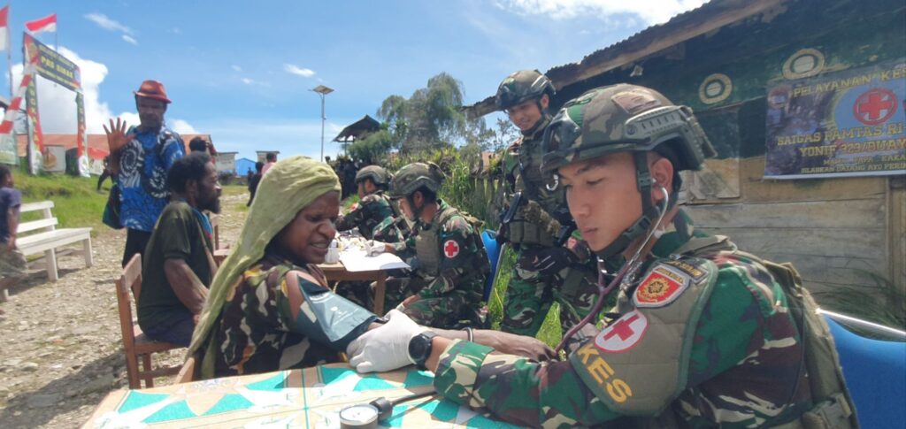Sinak Puncak // nusantararaya.com / PenKoopsTNI – Satuan Tugas Batalyon Infanteri (Satgas Yonif) Raider 323/Buaya Putih Kostrad, salah satu Satuan Jajaran Komando Operasi TNI (KOOPS TNI) di Papua, tengah melaksanakan tugas Operasi Pengamanan Perbatasan Mobil RI-PNG, di wilayah Kabupaten Puncak, Provinsi Papua Tengah. Pada hari Selasa, 30 Juli 2024, Satgas Yonif 323 Kostrad, khususnya Pos Sinak pimpinan Mayor Inf Firman, mengundang warga masyarakat dari Kampung Gigobak, Distrik Sinak, Kabupaten Puncak, untuk mengikuti kegiatan pelayanan kesehatan gratis.