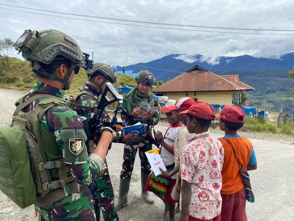 Sugapa Intan Jaya // nusantararaya.com / PenKoopsTNI – Satuan Tugas Batalyon Infanteri (Satgas Yonif) Raider 509/Balawara Yudha Kostrad, bagian dari Komando Operasi TNI (KOOPS TNI) di Papua, tengah melaksanakan tugas Operasi Pengamanan Perbatasan Mobil RI-PNG, khususnya di wilayah Kabupaten Intan Jaya, Provinsi Papua Tengah. Pada hari Senin, 29 Juli 2024, Satgas Yonif 509 Kostrad, khususnya Pos J2 pimpinan Kapten Inf Patria, berkreativitas dalam melaksanakan tugasnya dengan menyempatkan penyebarluasan Wawasan Kebangsaan (Wasbang) kepada anak-anak Kampung Bilogai, Distrik Sugapa. Bertempat di depan Pos J2, para Prajurit Satgas Yonif 509 Kostrad yang sedang melaksanakan Pengamanan Wilayah, sempat bertatap muka dengan anak-anak yang sedang melintas di depan Pos.