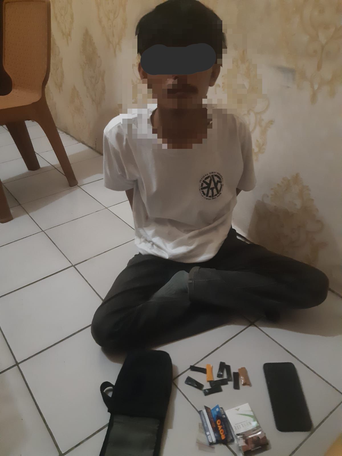 Dijelaskan kemudian saksi Sdr. Herman menghampiri dan menanyakan orang tersebut ” MAU KEMANA DAN DARI MANA ” tetapi orang yang tidak kenal tersebut merasa tersinggung dan marah dengan menjawab ” NGAPAIN PAK LIHATIN MELULU, SAYA MAU PULANG KE CISEENG ” kemudian Saksi Sdr. H bertannya kembali, ” KALAU MAU PULANG KE CISEENG KO ADA DISINI ” Pelaku menjawab ” SAYA NGIKUTIN GOOGLE MAPS ” kemudian saksi Sdr. T datang dan langsung mengambil HP dan kunci Motor pelaku dan saksi Sdr. T melihat di HP pelaku ada poto batu yang ditandai ceklisan warna merah yang diduga tempat penyimpanan narkoba dan poto jalan serta serlokan lokasi melalui google maps berikut list jumlah Narkoba yang sudah di tempelin di beberapa tempat yang berbeda, kemudian saksi Sdr. T merasa curiga terhadap pelaku dan langsung membawa pelaku kedalam Toko Pelangi Mebel selanjutnya Sdr. T mengambil tas pinggang pelaku dan memeriksa isi tas tersebut dan di temukan sejumlah 8 (delapan) paket kecil yang di bungkus pipet warna hitam yang diduga narkotika jenis sabu-sabu dan 2 (bungkus) fafer kertas rokok warna biru berikut 1 (satu) buah plastik bungkus sinte (tembakau sintetis) didalam tas pinggang pelaku kemudian Sdr. T menggeledah kantong celana pelaku dan Sdr. T menemukan 1 (satu) paket yang dibungkus pipet warna kuning dari kantong celana depan sebelah kanan yang diduga sinte (tembakau sintetis), selanjutnya Sdr. Y melaporkan ke Polsek Ciampea dan selanjutnya di bawa oleh petugas Polsek Ciampea untuk diamankan di Kantor Polsek Ciampea.