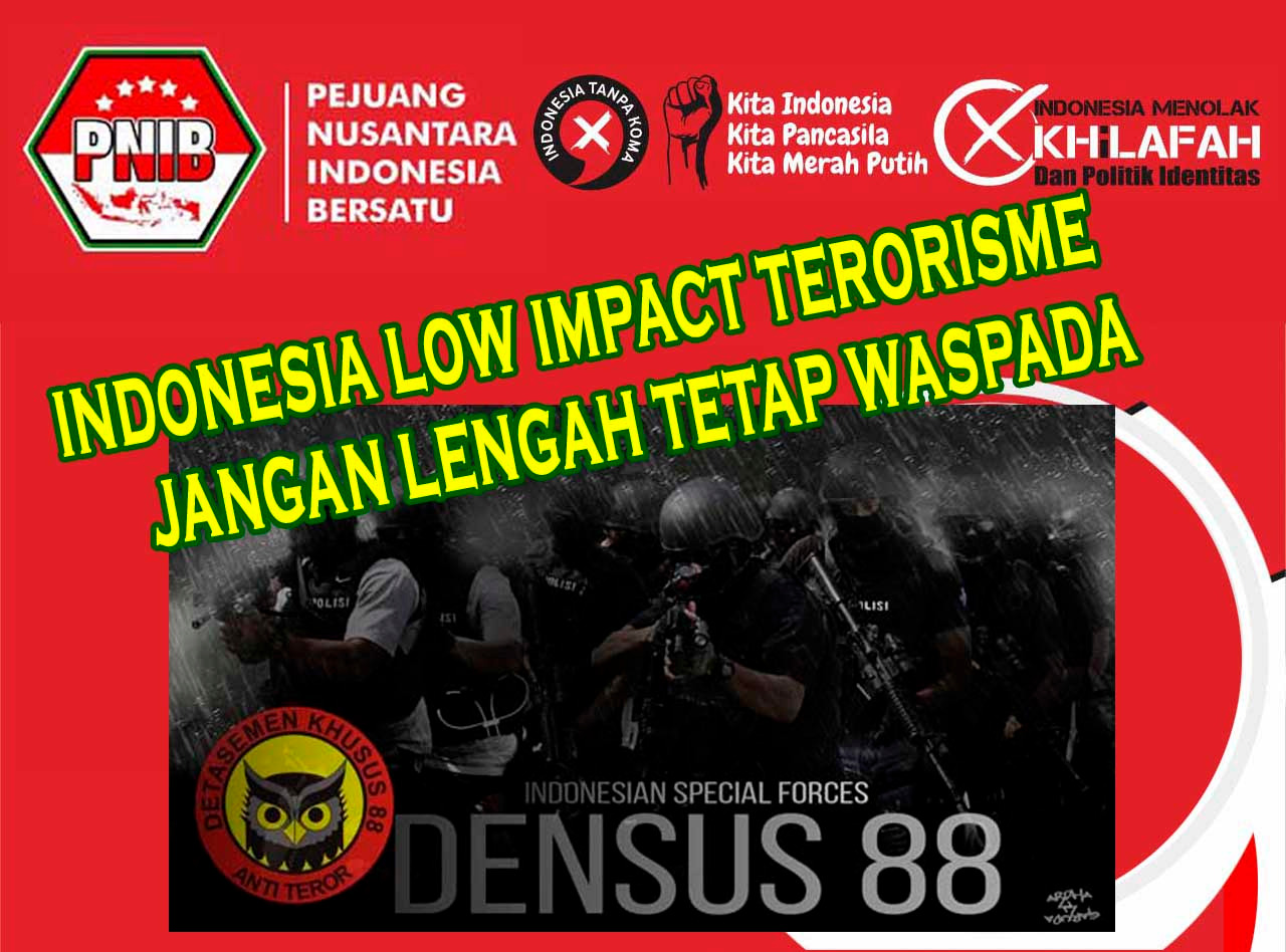 Jakarta // nusantararaya.com /. Menurut World Terrorism Index 2024, Indonesia berada di peringkat ke-51 dari total 130 negara dengan skor 20 yang termasuk kategori low-impact atau negara dampak rendah terkait terorisme. Hal tersebut tak terlepas dari upaya berbagai pihak, kepolisian, Densus 88, BNPT, BIN, dan semua pihak termasuk civil society.