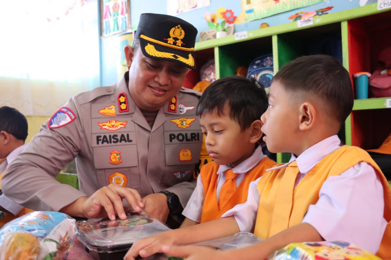 Kapolres Dairi, AKBP Faisal Andri Pratomo, SH, SIK, M.M., M.Si bersama Ketua Bhayangkari Dairi, Ny Faini Faisal serta pejabat utama lainnya melakukan kunjungan ke TK Kemala Bhayangkari dalam pemberian makan bergizi gratis, Kamis (30/1/2025).