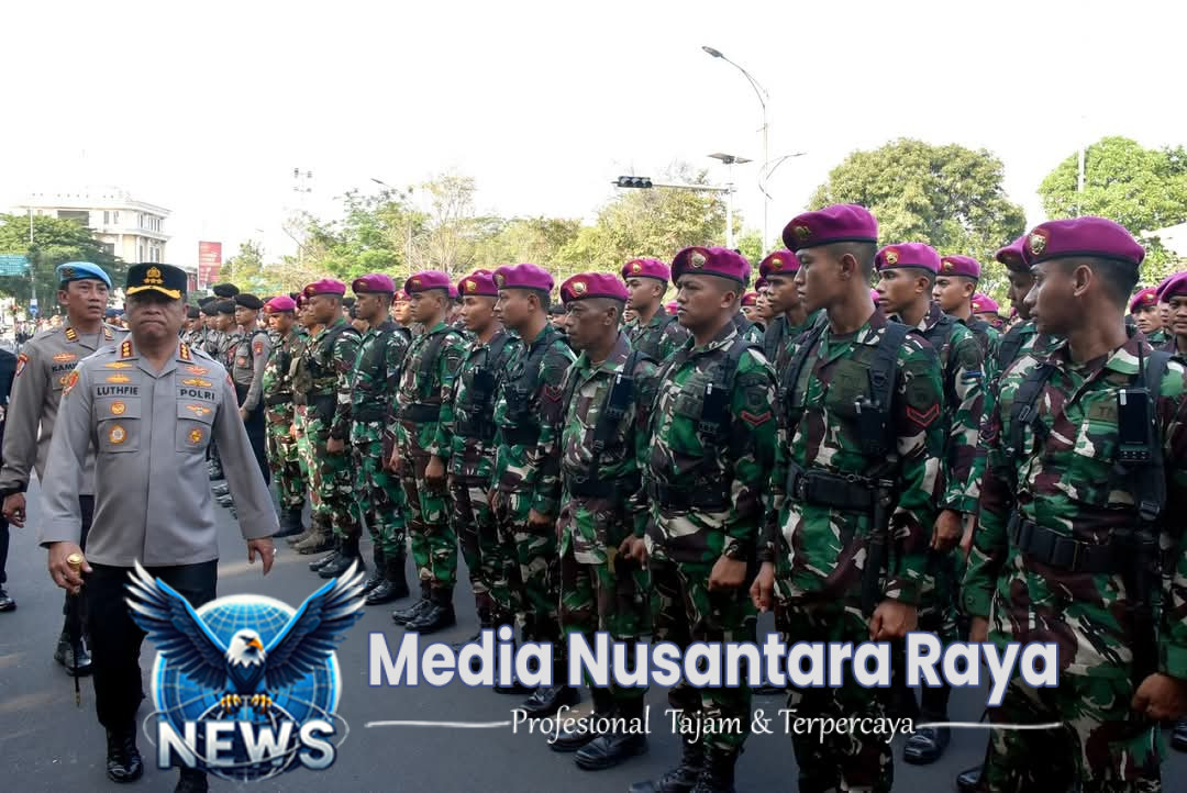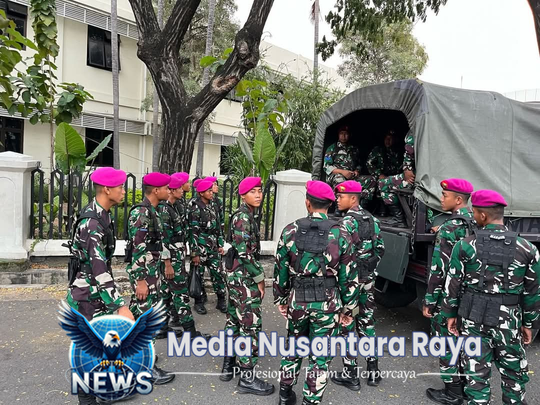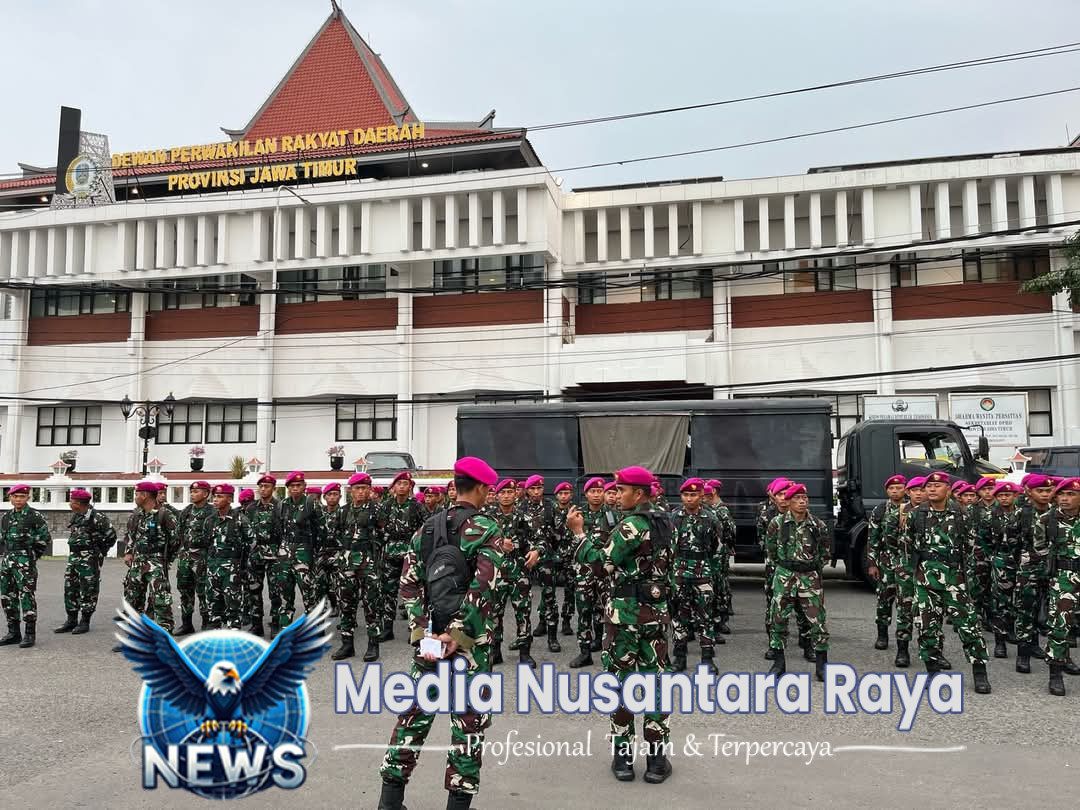 SURABAYA//NUSANTARARAYA.COM//Dalam rangka mengantisipasi demo Hari Buruh, Perwira Batalyon Infanteri 5 Marinir Lettu Marinir Mardian Priyudha Beserta Prajurit Melaksanakan pengamanan gabungan aparat TNI / Polri di Gedung Kantor Gubernur Jawa Timur Jalan Pahlawan Surabaya, Jawa Timur. Kamis (01/05/2025).