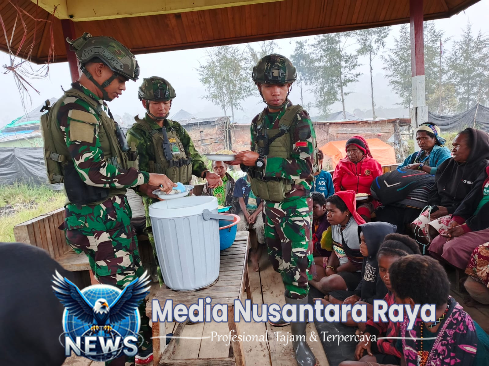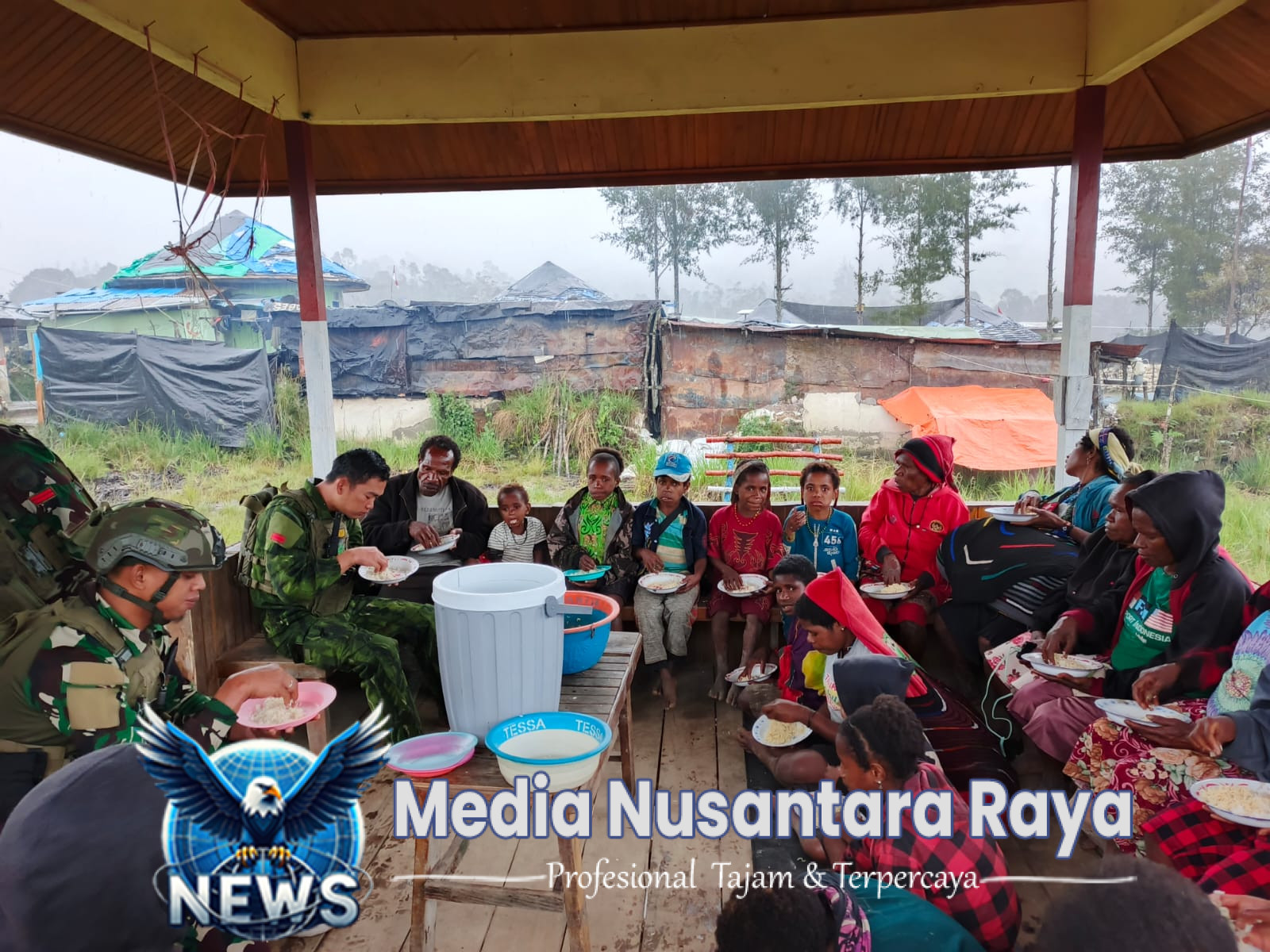 DISTRIK OMUKIA//NUSANTARARAYA.COM//Kebersamaan yang terjalin antara Prajurit Satgas Yonif 700/Wira Yudha Cakti dan warga Kampung Eronggobak tak berhenti di ruang ibadah. Meskipun hujan deras mengguyur, semangat persaudaraan semakin terasa hangat ketika usai berdoa bersama, mereka melanjutkan acara dengan makan siang bersama di Pos Eromaga, Distrik Omukia, Kab Puncak, Papua.(04/05)