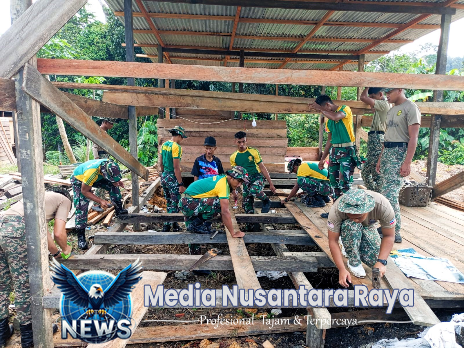 Kegiatan ini berupa gotong royong pembangunan rumah milik pribadi Bapak Rahma, salah satu warga desa yang tengah membangun tempat tinggalnya. Dengan penuh semangat, prajurit Satgas bahu membahu bersama warga, mulai dari pengangkutan material hingga pemasangan atap rumah.