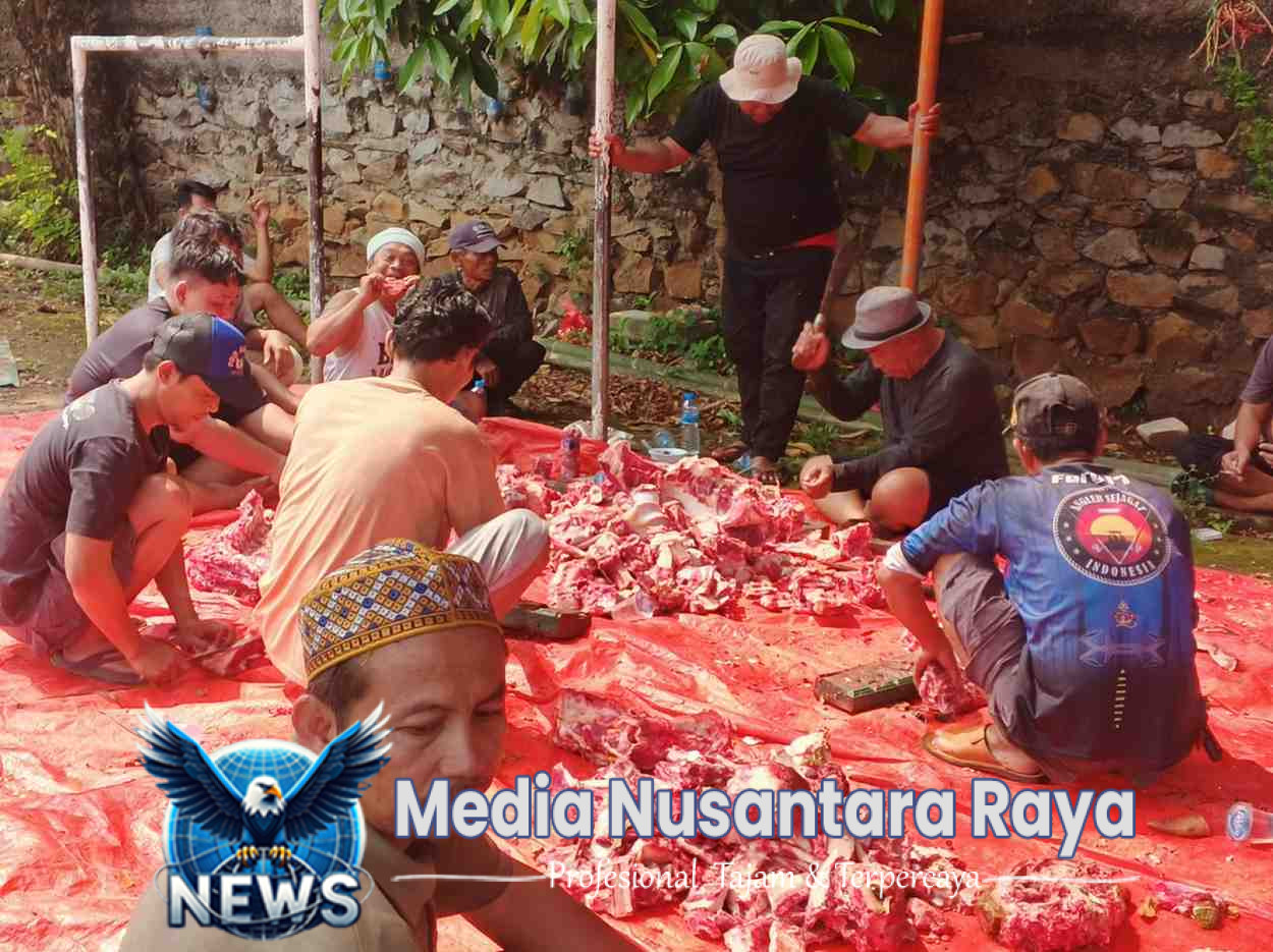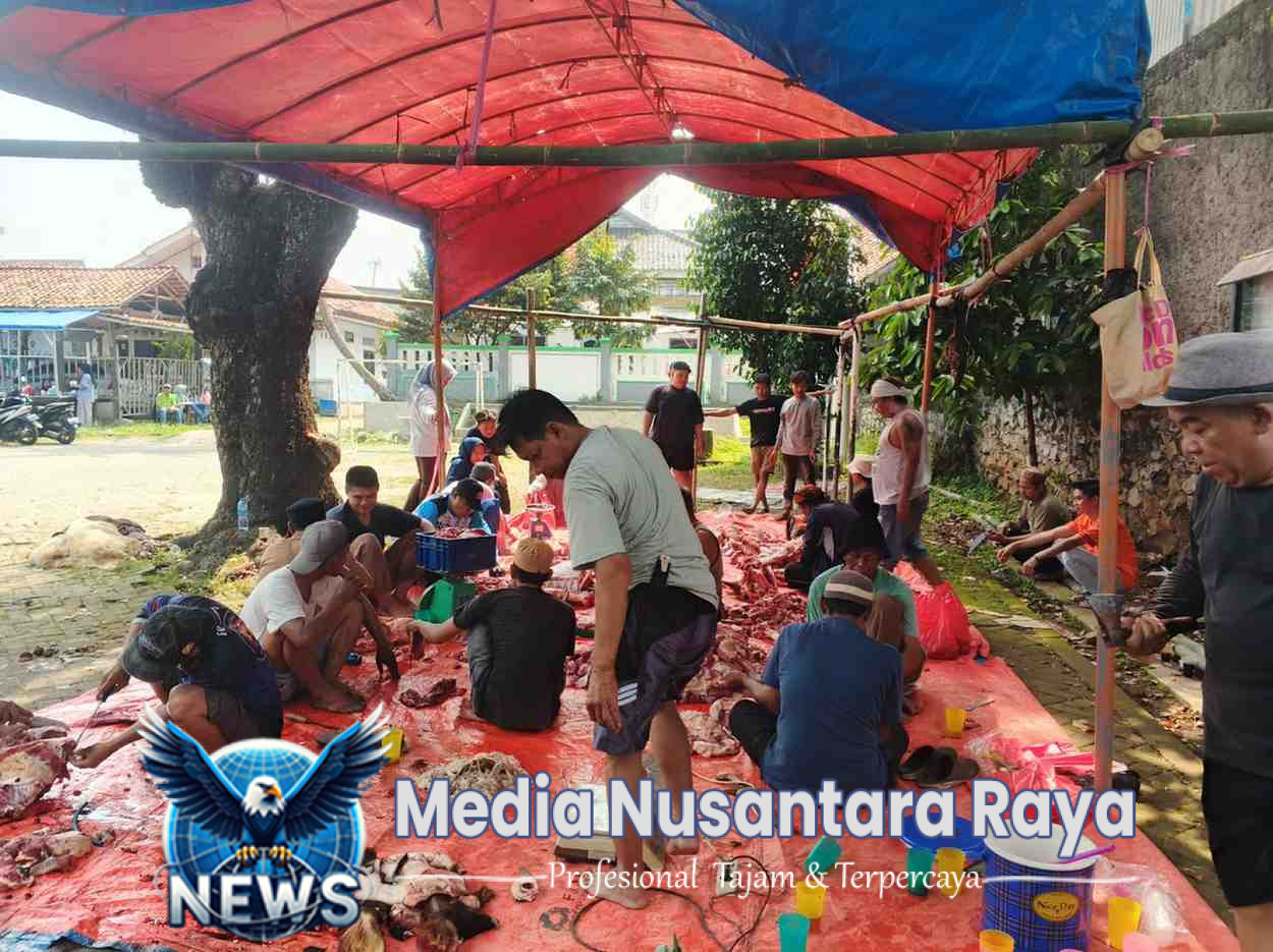 Kabupaten Bekasi//NUSANTARARAYA.COM// Dkm masjid Al mukarrobin kp kandang roda RT 12/06 Sukadami Cikarang Selatan memotong 3 sapi 7 kambing, pemotongan hewan qurban dihalaman sekolah SDIT Fidarussalam.Sabtu 07/06/2025
