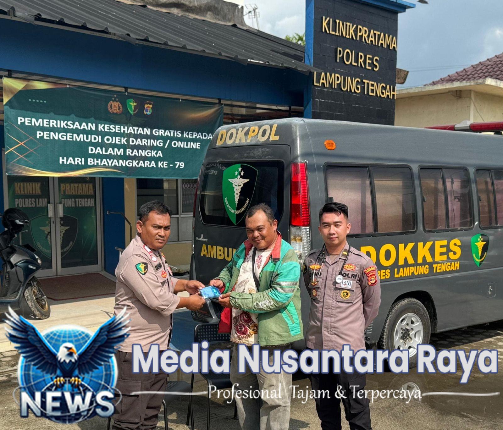 LAMPUNG TENGAH, NUSANTARARAYA.COM ~ Dalam rangka menyambut Hari Bhayangkara ke-79, Si Dokkes Polres Lampung Tengah menggelar kegiatan bakti sosial berupa pelayanan kesehatan gratis bagi para pengemudi ojek online (Ojol), Kamis siang (12/6/25).