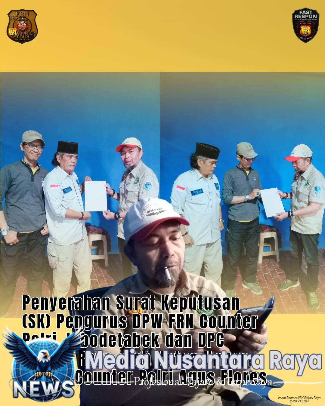BEKASI//NUSANTARARAYA.COM//Ketua Umum Perkumpulan Wartawan (PW) Fast Respon Nusantara (FRN) Counter Polri, Agus Flores, resmi menyerahkan Surat Keputusan (SK) kepengurusan kepada DPW FRN Counter Polri Jabodetabek dan DPC FRN Counter Polri Bekasi Raya dalam kunjungannya ke kantor baru FRN di Bekasi Raya, Jumat (1/8/2025).