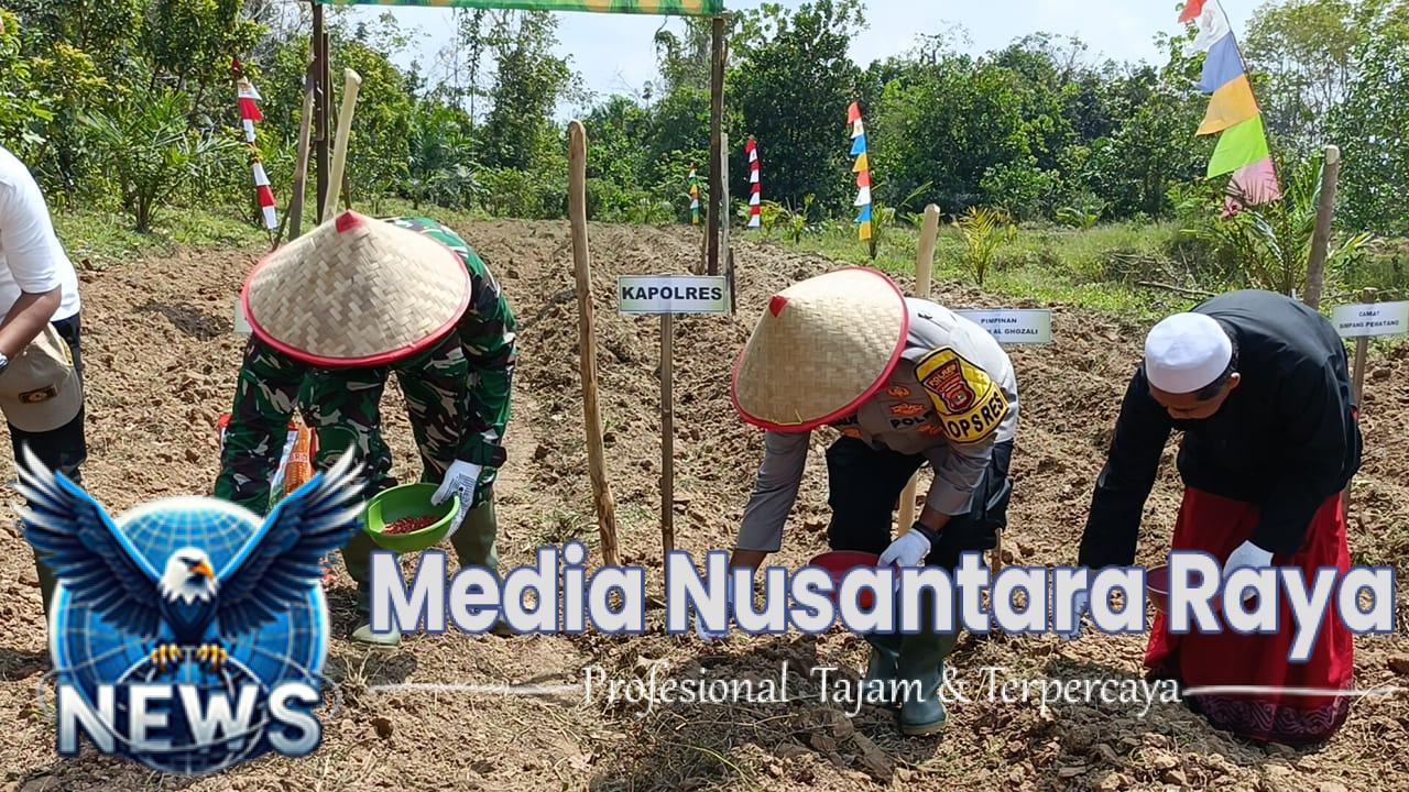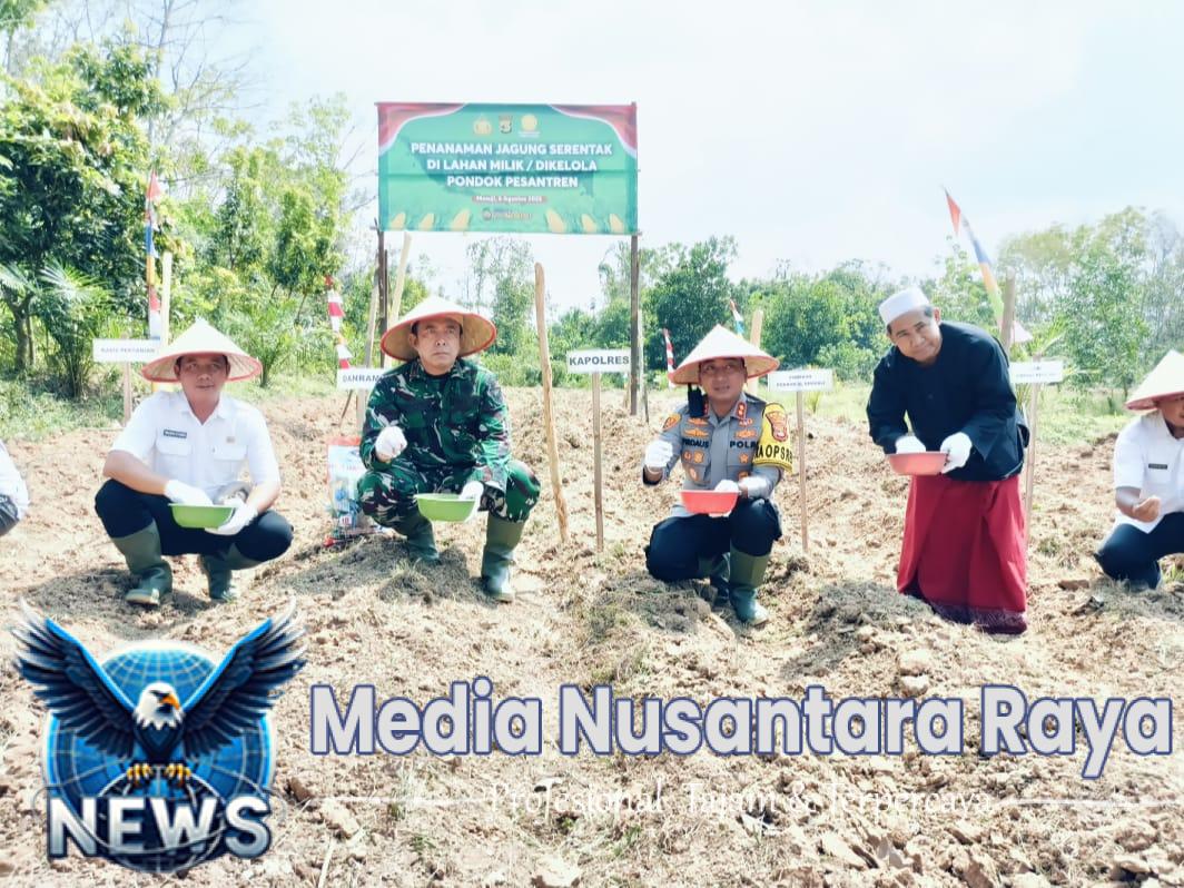 MESUJI LAMPUNG, NUSANTARARAYA.COM ~ Polres Mesuji bersama Forkopimda, TNI dan Pihak Pondok Pesantren melaksanakan penanaman jagung serentak di lahan pondok pesantren, bertempat di lahan Pondok Pesantren Al – Ghazali Desa Jaya Sakti Kecamatan Simpang Pematang Kabupaten Mesuji. Rabu (06/08/25)