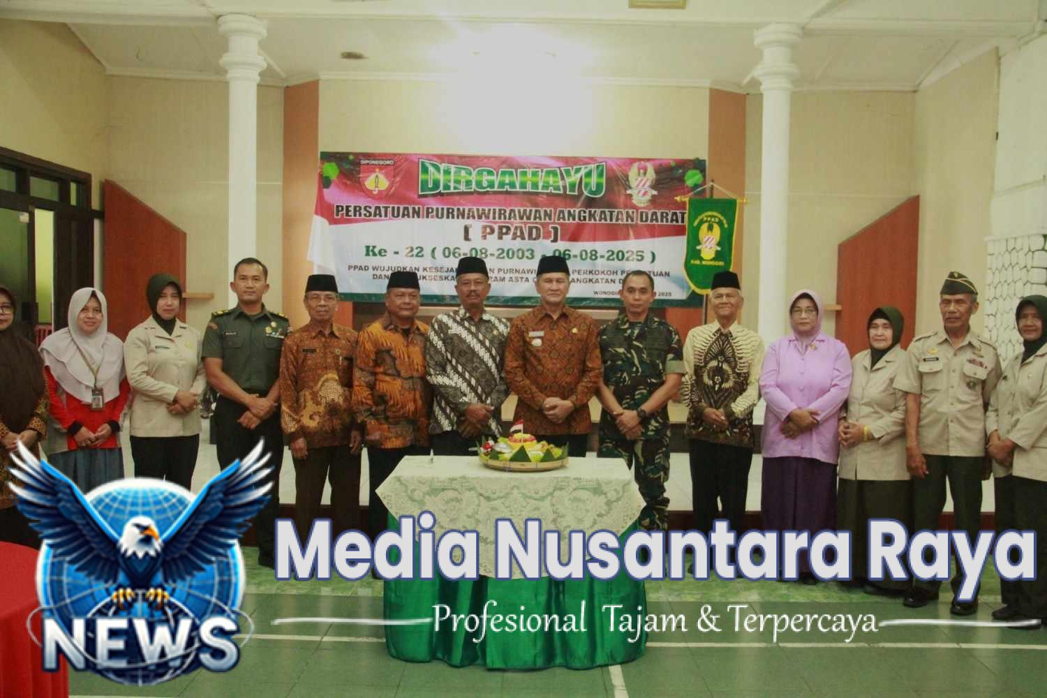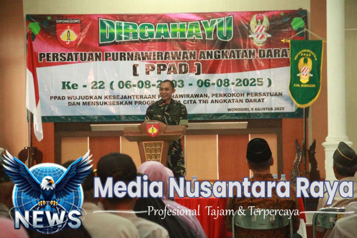 WONOGIRI//NUSANTARARAYA.COM//- Persatuan Purnawirawan TNI Angkatan Darat (PPAD) Wonogiri, menggelar syukuran dalam rangka Hari Ulang Tahun (HUT) ke-22 yang dihadiri Bupati Wonogiri Setyo Sukarno dan Komandan Kodim 0728/Wonogiri Letkol Inf Edi Ristriyono. Mengangkat tema “PPAD wujudkan kesejahteraan Purnawirawan, perkokoh persatuan dan mensukseskan program Asta Cita bersama TNI Angkatan Darat”, syukuran digelar di Aula Makodim 0728/Wonogiri, Sabtu (9/8/2025).