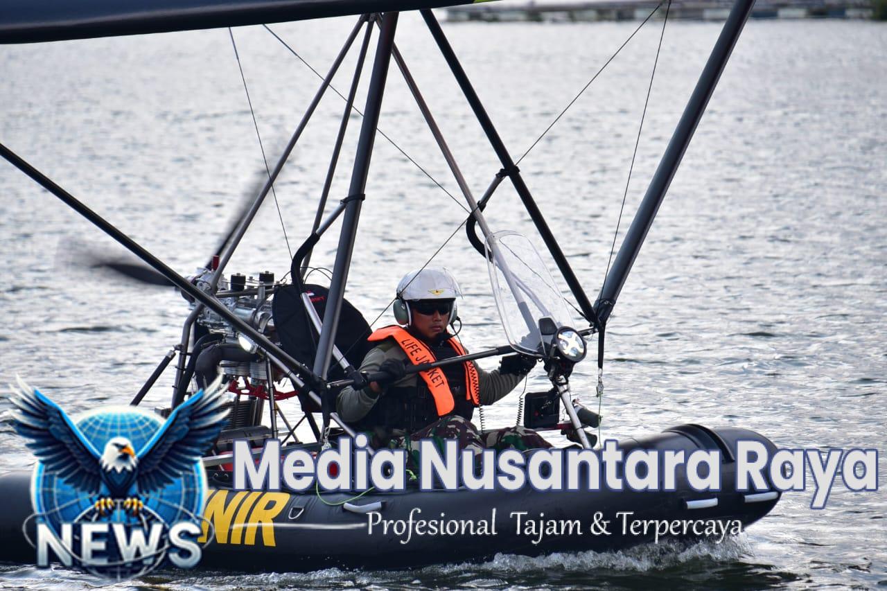 BATUJAJAR//NUSANTARARAYA.COM// Prajurit Pasmar 1 dari Batalyon Intai Amfibi 1 Marinir (Yontaifib 1 Mar) mengoperasikan Flying Inflatable Boat (FIB) untuk melaksanakan demonstrasi udara pada Upacara Gelar Pasukan Operasional dan Kehormatan Militer yang dilaksanakan di Pusdiklatpassus, Batujajar, Bandung Barat, Jumat (08/08/2025).