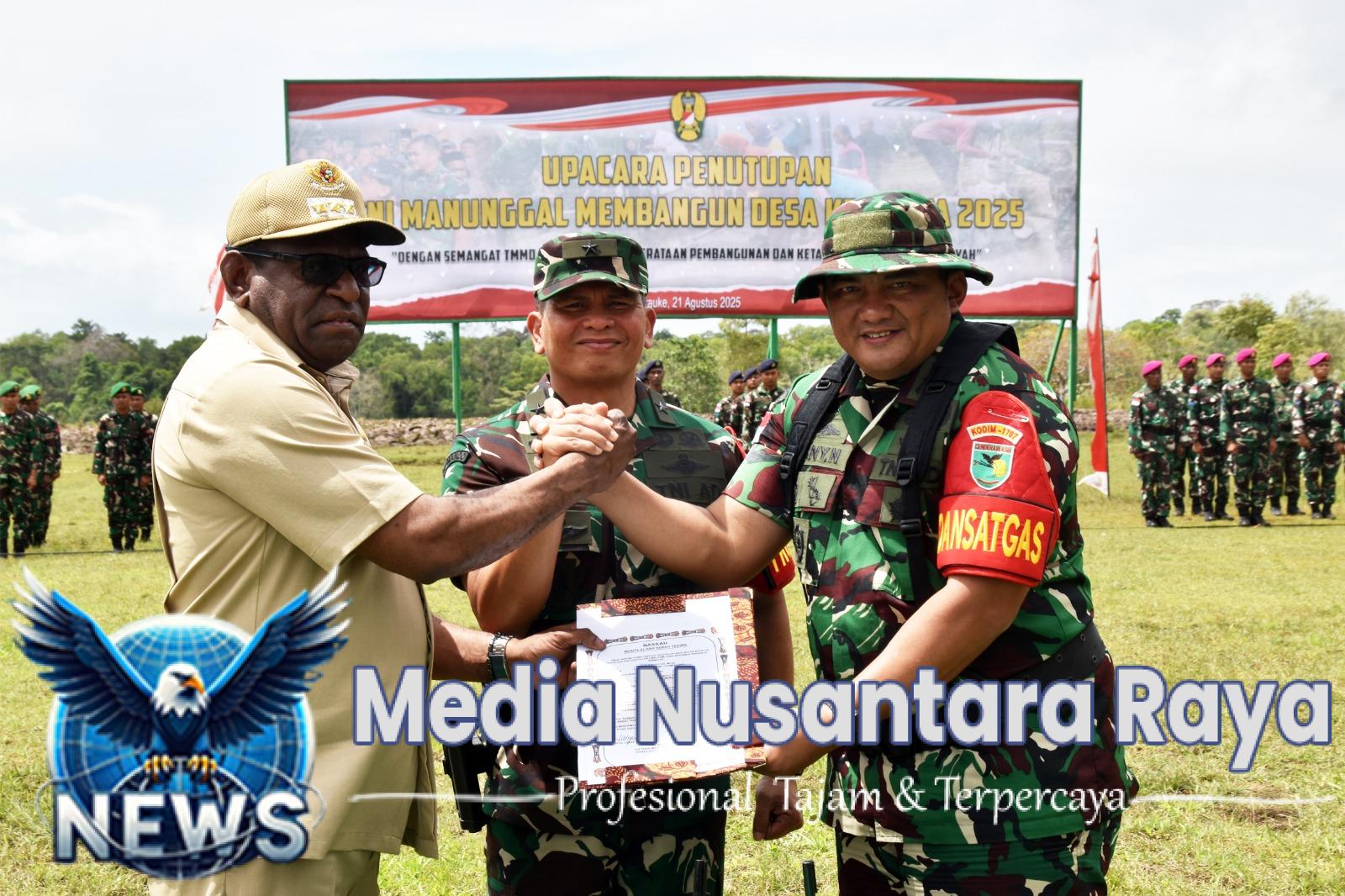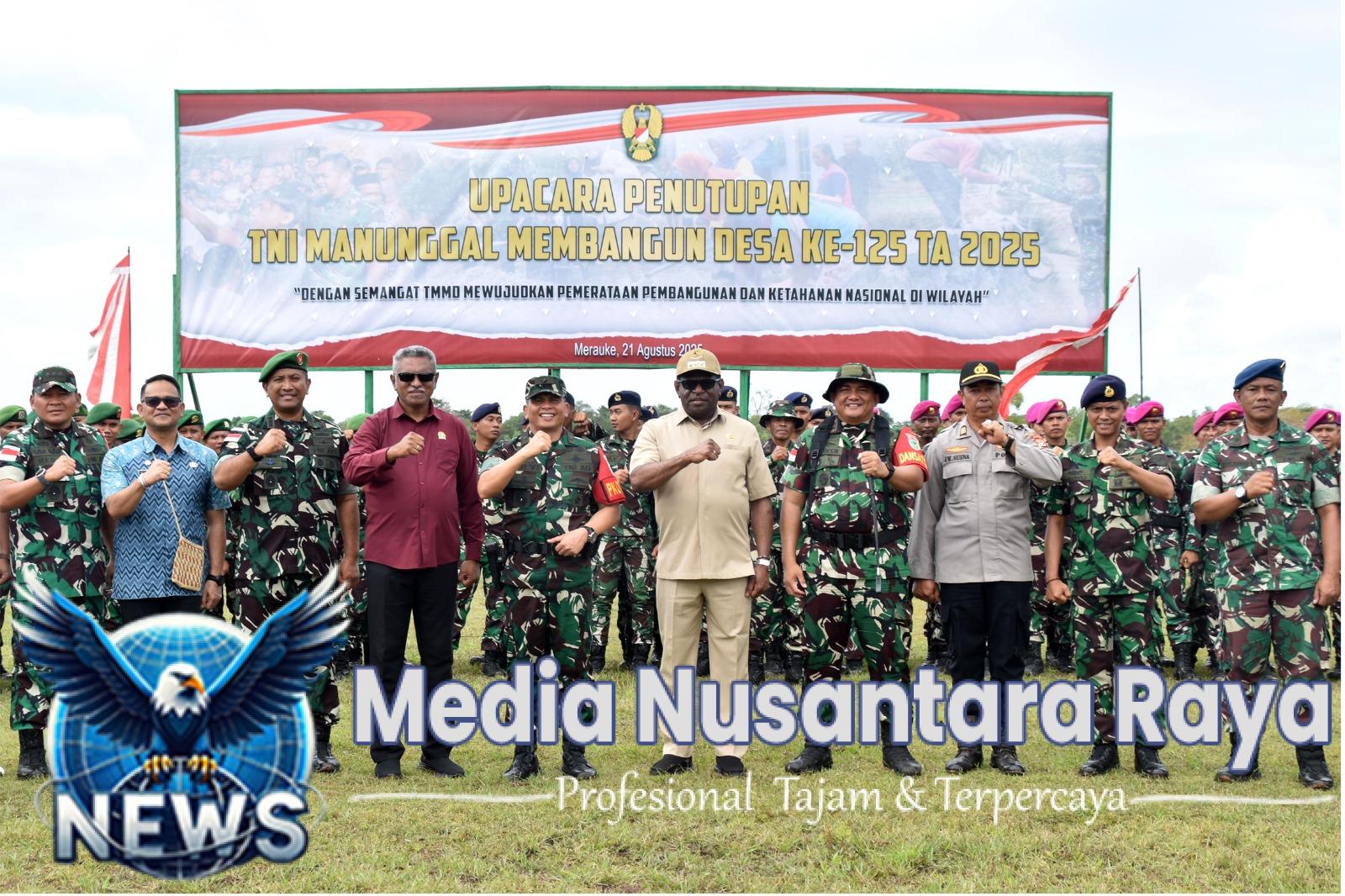 MERAUKE//NUSANTARARAYA.COM//, 21 Agustus 2025 – Di tengah semilir angin dan hangatnya sinar matahari di Lapangan Kampung Kamno Sari, Distrik Jagebob, Kabupaten Merauke – Papua Selatan, semangat kebersamaan dan gotong royong terasa begitu kuat. Kamis siang, Brigjen TNI Thevi A. Zebua, S.E., M.M. Kasdam XVII/Cenderawasih secara resmi menutup kegiatan (TMMD) ke-125 yang diselenggarakan oleh Kodim 1707/Merauke.