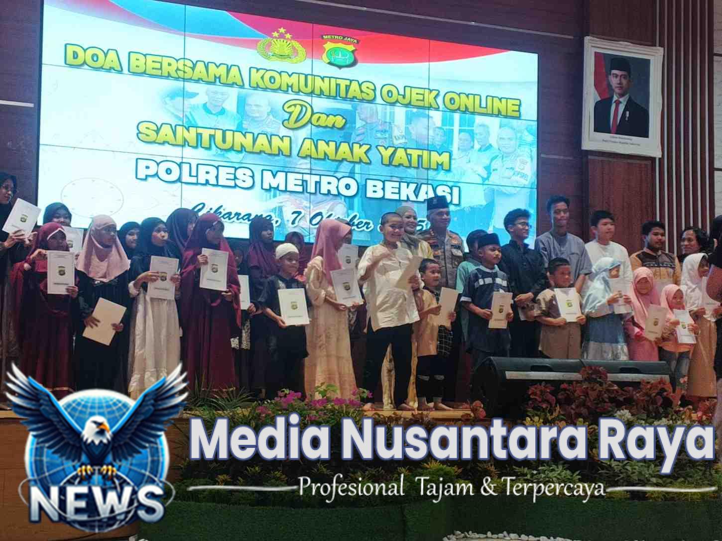 BEKASI//NUSANTARARAYA.COM// Dalam rangka mempererat silaturahmi, menumbuhkan kepedulian sosial, serta mewujudkan situasi kamtibmas yang aman dan kondusif, Polres Metro Bekasi menggelar kegiatan Doa Bersama Komunitas Ojek Online dan Santunan Anak Yatim, bertempat di Aula Gedung Promoter Polres Metro Bekasi, pada Selasa (7/10/2025) pukul 13.00 WIB.
