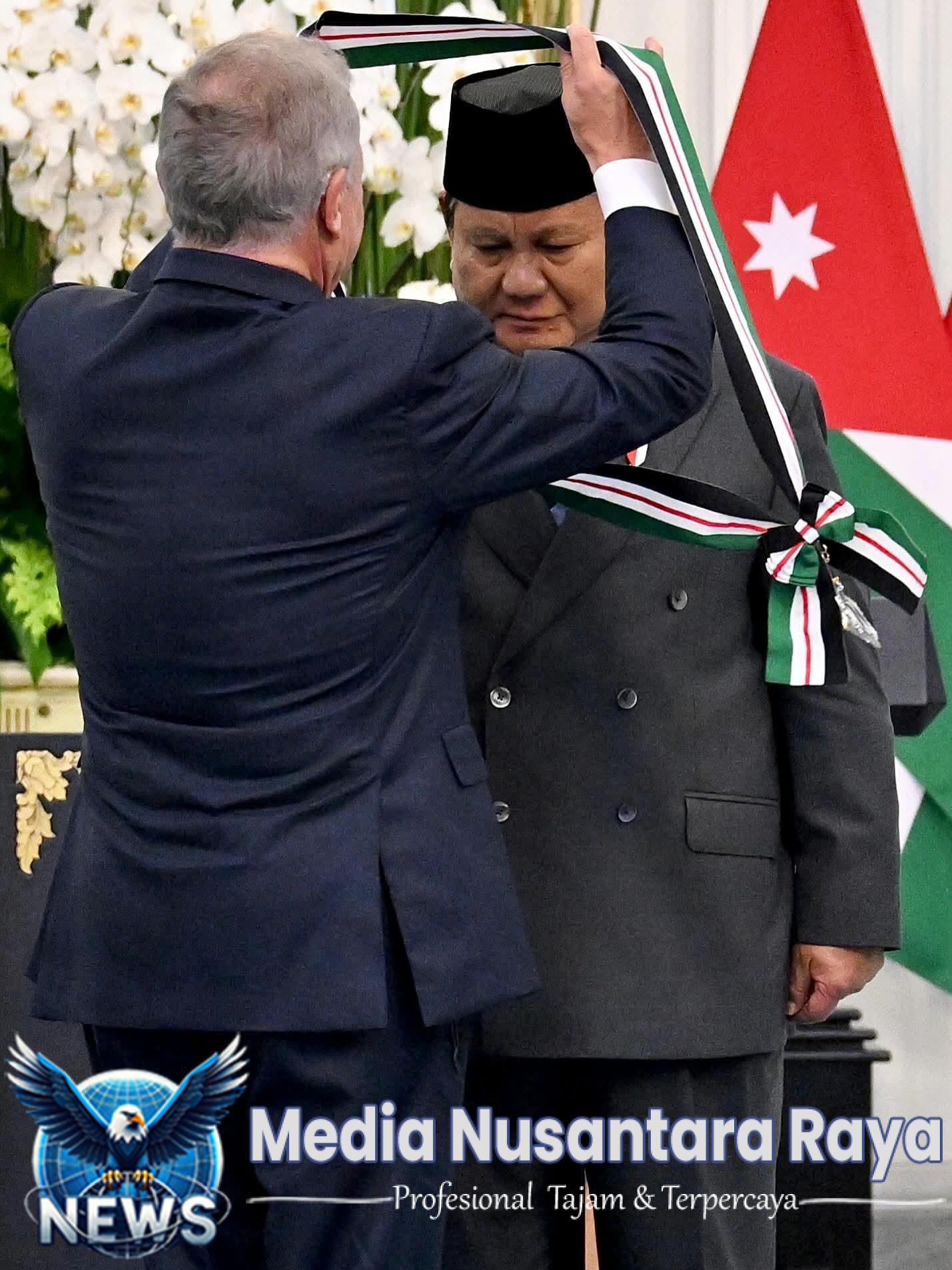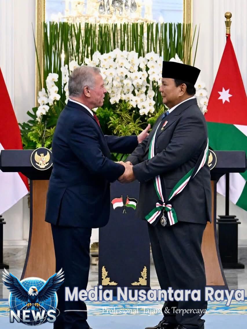 JAKARTA, NUSANTARARAYA.COM ~ Presiden Prabowo Subianto menerima penghargaan “The Bejewelled Grand Cordon of Al Nahda (Order of the Renaissance)” dari Raja Kerajaan Yordania Hasyimiah, Raja Abdullah II ibn Al Hussein. Penghargaan ini diberikan langsung oleh Raja Abdullah II ibn Al Hussein dalam kunjungan kenegaraannya ke Indonesia, Jumat (14/11/2025), dalam sebuah acara yang berlangsung di Istana Merdeka, Jakarta.