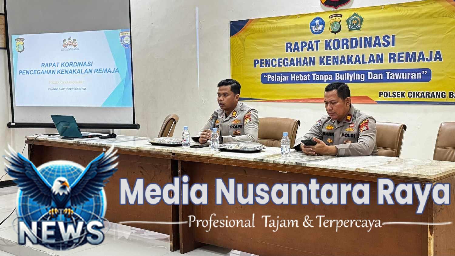 CIKARANG BARAT//NUSANTARARAYA.COM// Polsek Cikarang Barat menggelar Rapat Koordinasi Pencegahan Kenakalan Remaja dengan tema “Pelajar Hebat Tanpa Bullying dan Tawuran”. Kegiatan ini berlangsung pada Jumat, (21/11/2025), bertempat di Aula Mapolsek Cikarang Barat, Jl. Imam Bonjol No. 17, Kelurahan Telagaasih.