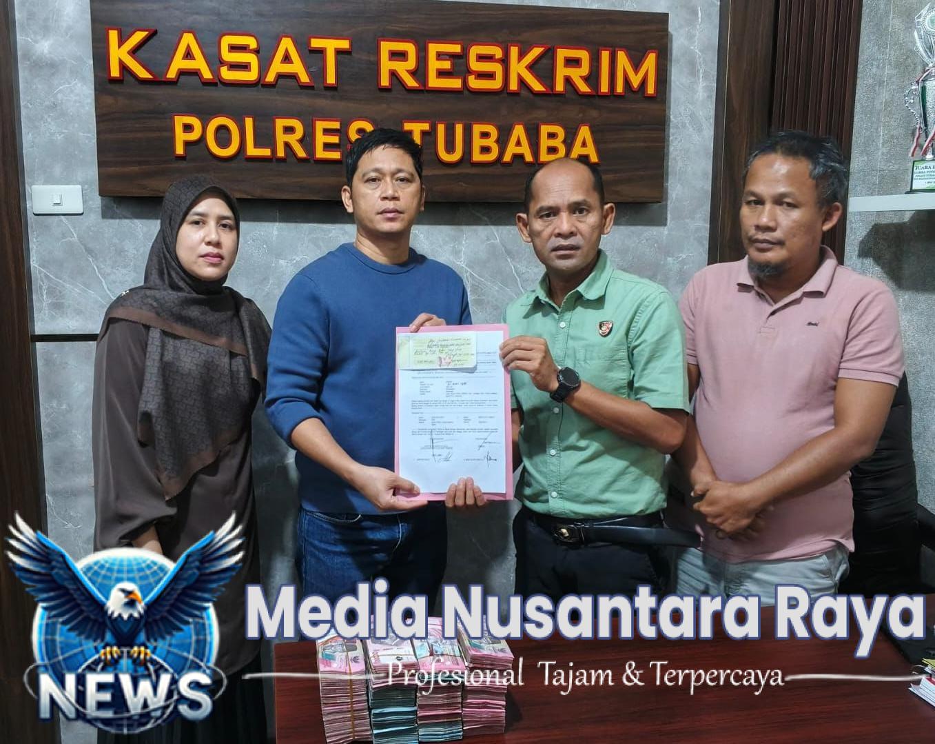 Tulang Bawang Barat // medianusantararaya.com / Penyidik Sat Reskrim Polres Tubaba Polda Lampung Kembalikan Uang 300 juta Hasil kejahatan Kepada Korban BS dan MMW, Penyerahan uang Tersebut merupakan barang Bukti oleh penyidik di titipkan Kepada Korban di Ruang Kasat Reskrim Polres Tubaba, Selasa (03/03/2026)