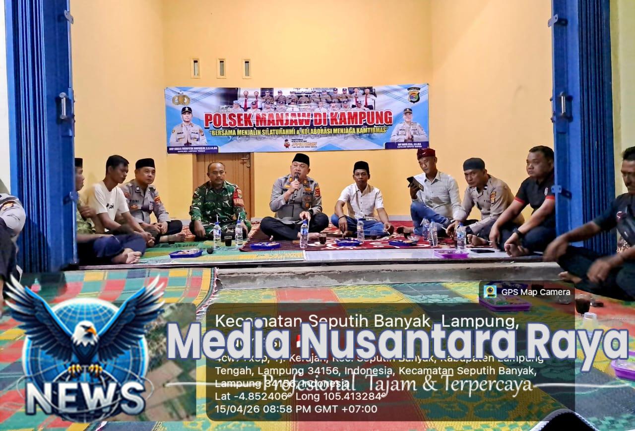 LAMPUNG TENGAH // NUSANATARARAYA.COM / Dalam upaya memperkuat keamanan dan ketertiban masyarakat (Kamtibmas), jajaran Polsek Seputih Banyak, Polres Lampung Tengah Polda Lampung kembali menunjukkan eksistensinya dengan hadir langsung di tengah masyarakat melalui kegiatan Polsek Manjaw di Kampung (PMK), yang digelar di Kampung Tanjung Kerajan, Rabu malam (15/4/2026).