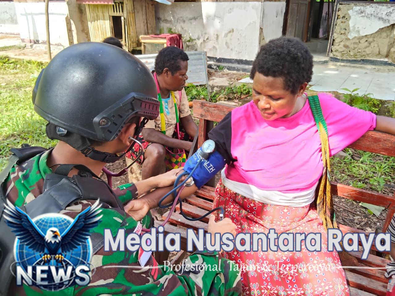 Dalam kegiatan ini, tim medis Satgas memberikan pemeriksaan kesehatan gratis kepada warga, mulai dari pengukuran tensi, hingga pengobatan umum.